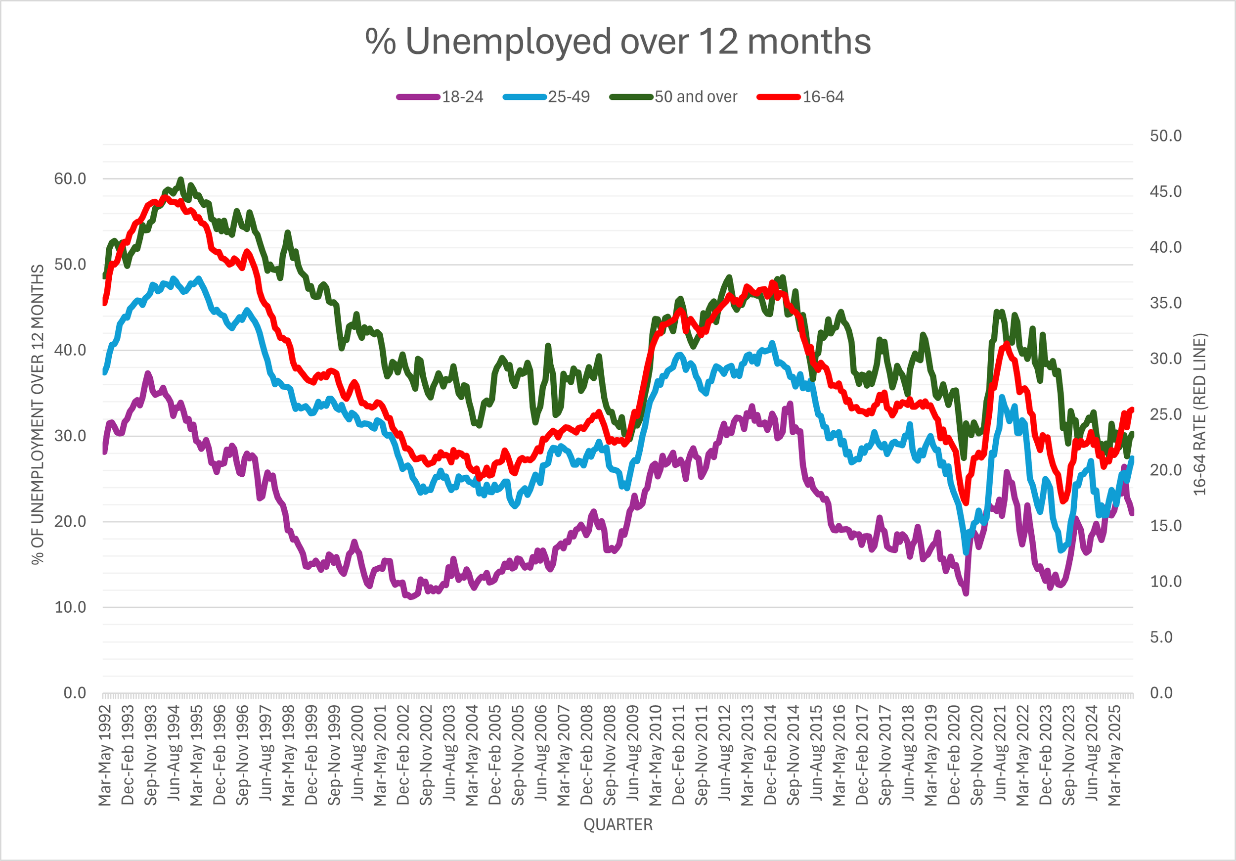 Although unemployment rates matter, they offer a limited picture. Unemployment is part of normal labour‑market functioning, capturing people between jobs, taking short breaks, or facing longer-term barriers. What we should focus on more closely is how long individuals remain unemployed. The longer someone is out of work, the greater the risk of scarring to their earning potential and employment prospects. Looking at the proportion of unemployed individuals out of work for more than 12 months in the LFS data from 1992 to Dec 2025: